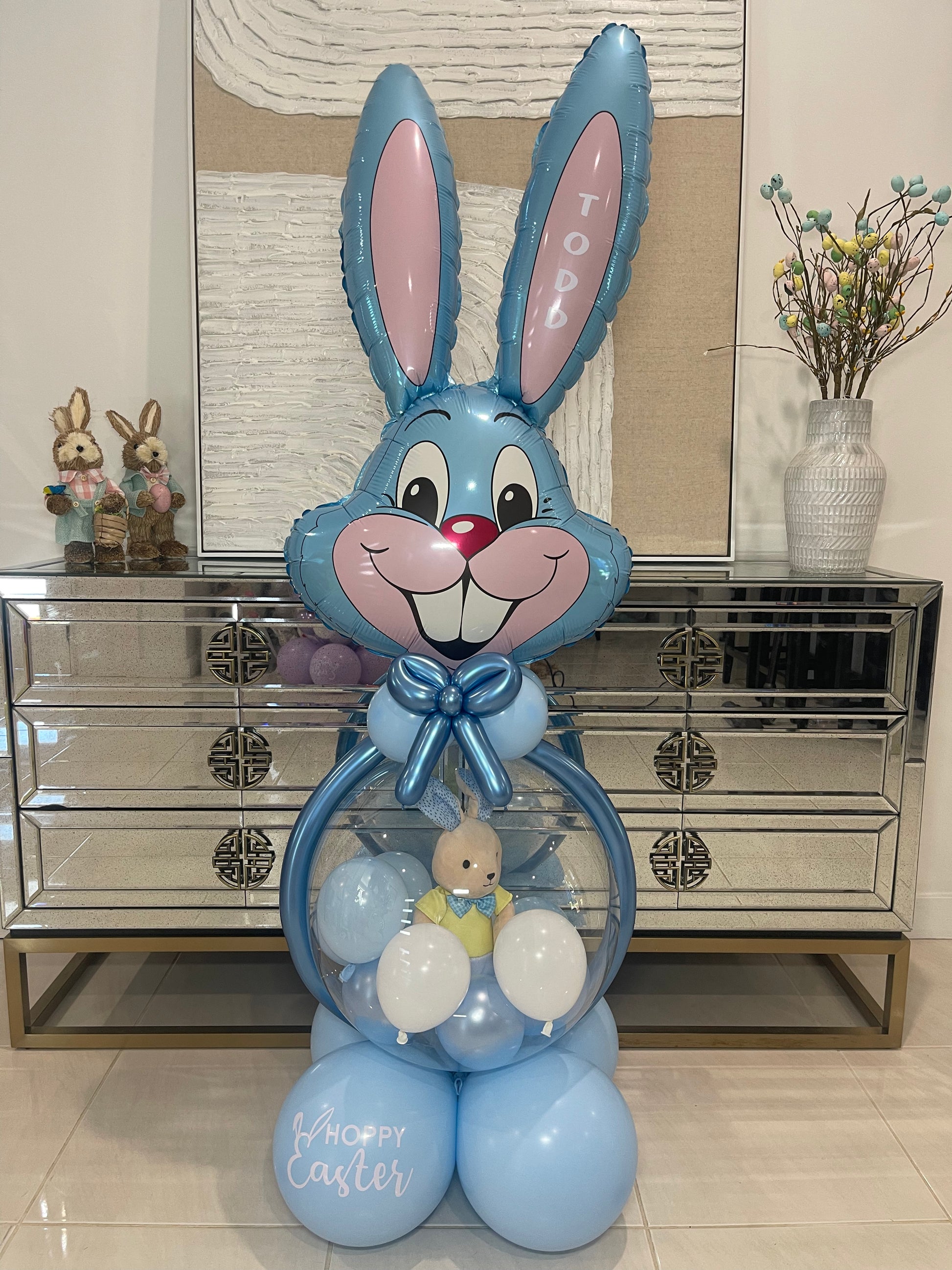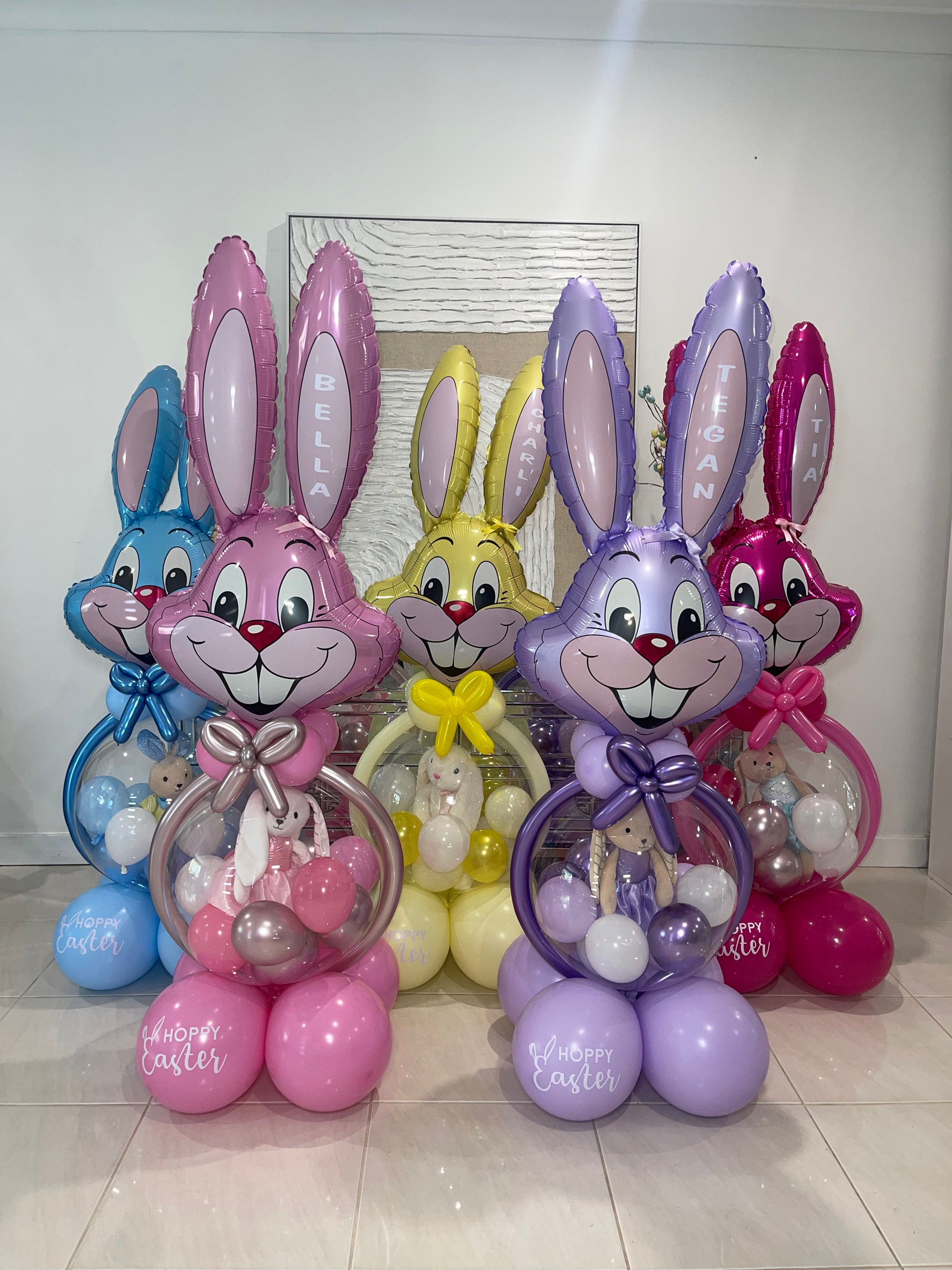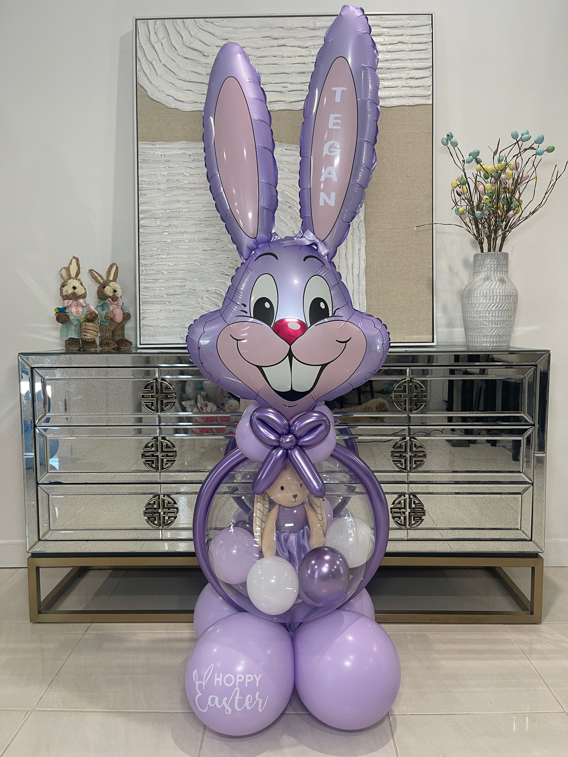 Introducing the Giant Bunny - the ultimate Easter surprise! Standing at 1.4m tall, this playful balloon has a clear belly filled with colourful balloons and a plush bunny inside. It will also be personalised with a name on the ear.